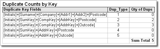 Duplicates can be identified using up to 255 separate client defined analysis keys. The software allocates an auditable status code to any duplicate data telling you which data is duplicated and why.